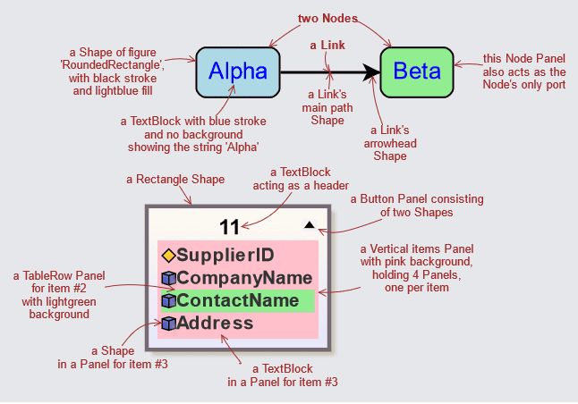 First, look at a diagram that includes comments about the GraphObjects used to build some example nodes and links: