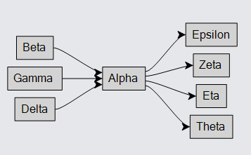 Let us specify that links coming into a node connect at the middle of the left side, and that links going out of a node connect at the middle of the right side. Such a convention is appropriate for diagrams that have a general sense of direction to them, such as the following one which goes from left to right.