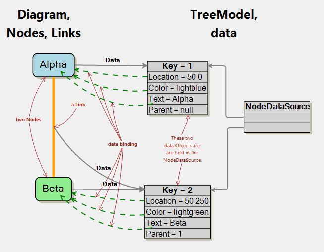 The two Nodes and one Link belong to the Diagram and are on the left side, with shadows. The TreeModel and the two data objects in its Model.NodeDataSource are on the right side, in gray.