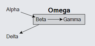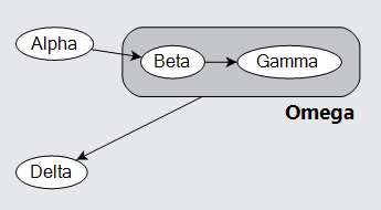 Here is a simple example of four regular nodes and one group node. In this example the link from "Alpha" goes directly to the "Beta" node, but the link to "Delta" actually comes from the "Omega" group rather than from any particular member of the group.