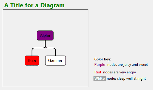 Sometimes in addition to the nodes and links that are the subject of a diagram, one also wants to display a "legend" or "key" describing the different kinds of nodes or links. Perhaps one also wants there to be "title" for the diagram in large letters.
