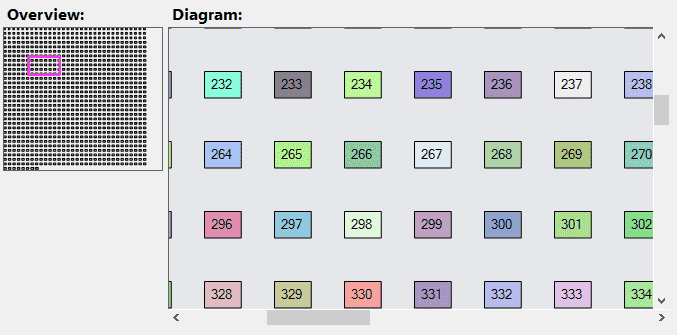 An Overview is a subclass of Diagram that is used to display all of the Parts of another diagram and to show where that diagram's viewport is relative to all of those parts. The user can also scroll the overviewed diagram by clicking or dragging within the overview.