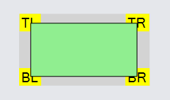 A Spot Panel aligns its content elements in the general location given by its GraphObject.Alignment. The precise point in the content element that is positioned defaults to Spot.Center, as seen above. But you can set the element's GraphObject.AlignmentFocus to use a different spot. For example, if you use the same AlignmentFocus as the Alignment, the elements will be just inside the main element's bounds: