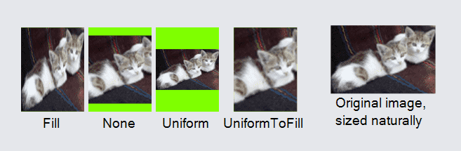 The following pictures demonstrate the four possible values for Picture.ImageStretch. All four Pictures here have the size 60x80 and show the same 100x65 PNG file. The Pictures also have a light green background, to show the space available that may be left unused, but is still part of the Picture's bounds.