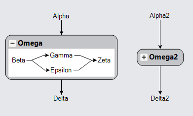 It is commonplace to provide a button on a group to allow users to collapse and expand groups as they wish. GoDiagram makes this easy to implement by providing a predefined kind of Panel, named "SubGraphExpanderButton", that acts as a button to collapse and expand Groups. This button changes the visibility of the member nodes and links but does not change the visibility of the group itself. When the group's visual tree includes a Placeholder, the placeholder will automatically shrink when the member parts become invisible and will inflate when the member parts become visible again.