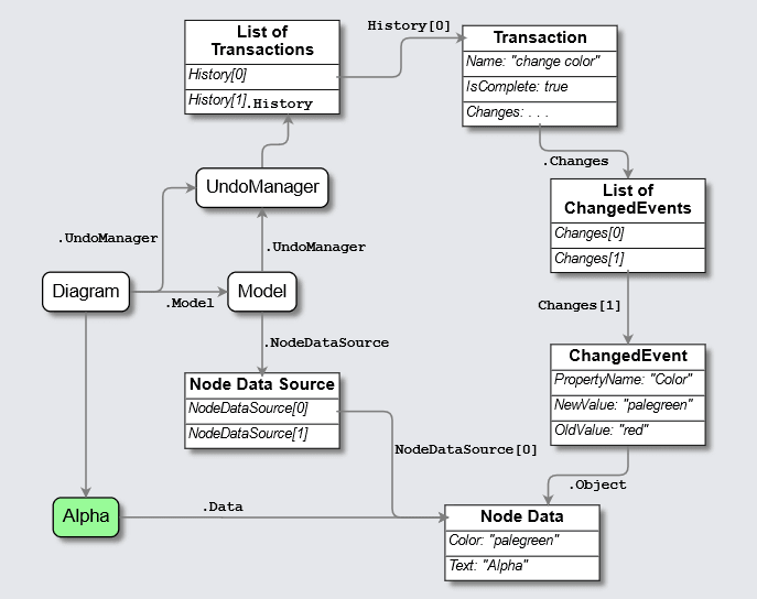 GoDiagram models and diagrams make use of an UndoManager that can record all changes and support undoing and redoing those changes. Each state change is recorded in a ChangedEvent, which includes enough information about both before and after to be able to reproduce the state change in either direction, backward (undo) or forward (redo). Such changes are grouped together into Transactions so that a user action, which may result in many changes, can be undone and redone as a single operation.